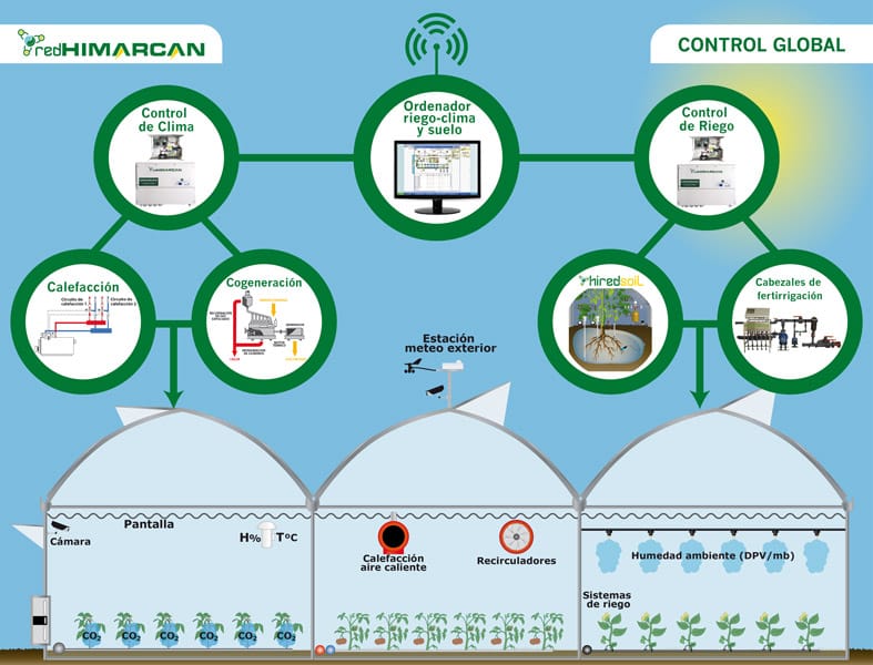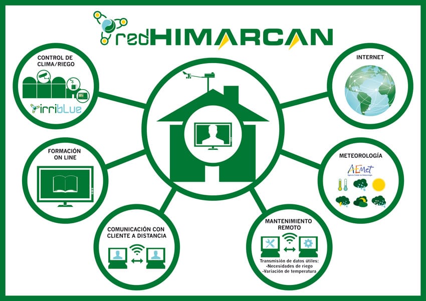 REDHIMARCAN es un programa de información y control que gestiona clima, riego y parámetros de suelo, bien individualmente o integrándolos todo en uno para controlar los cultivos en invernaderos de las nuevas unidades productivas. REDHIMARCAN está formado por un ordenador basado en la última tecnología (nanotecnología, fibra óptica, imágenes, conectividad, formación, etc.) con multitud de sensores que nos da la mayor información instantánea e histórica para gestionar los cultivos intensivos del clima mediterráneo.
